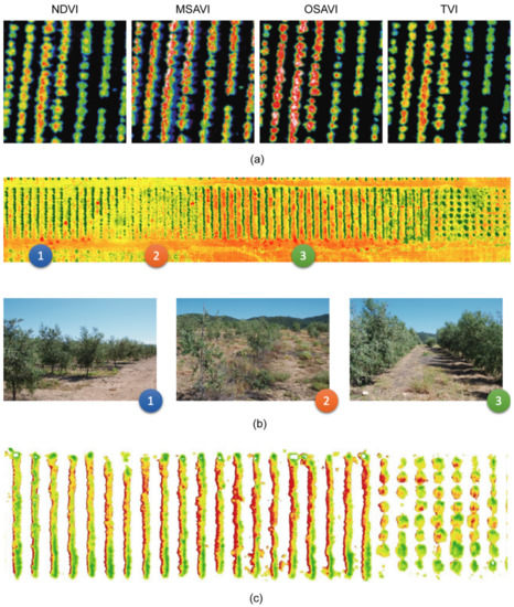 Figure 7a). Once these differences associated with the vigor of the tree have been detected, the student must analyze the cause. In the same manner, the students analyze the results obtained in the thermographic orthomosaic (