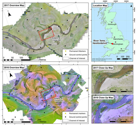 Our field setting is a 600-m-long reach of the River Teme in Herefordshire, near the England/Wales border, where we collected RPAS imagery in August 2016 and August 2017 (Figure 1). This is a lowland, meandering, dynamic, gravel-bed river system with channel widths of 3–13 m and a total catchment drainage area of 160,000 hectares [59]. In-channel hydromorphic diversity is good, palaeochannels are common (often still connected to the main water course), and median grain size (D50) of exposed surfaces is 21.5 mm. Our section of the River Teme has previously experienced significant channel change following a flood event in the winter of 2014–15 (as evidenced by before and after Google Earth imagery).