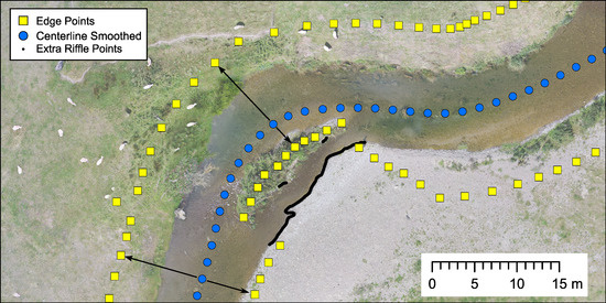 Water surface interpolation points. Centreline points (circles) are generated from the statistical smoothing operations. Edge points (squares) are copies of the centreline shifted orthogonally (black arrows) to create a solid interpolation surface that extends beyond the wetted channel. Additional points are added along the riffles to handle the more complex topography in the side channels.