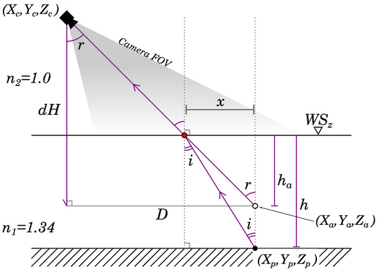 In our SfM data, the submerged portions of the point cloud are impacted by the refraction of light at the air–water interface. The result is that the submerged point elevations are too shallow (Figure 4). These points therefore represent the apparent depth () based on the water surfaces described above. To correct the point cloud, we used algebraic manipulations of Snell’s Law () to adjust the apparent depth to the “true” depth ().