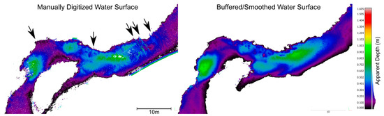 For each dataset, we digitised polyline features at the approximate edges of the water surface. The digitised lines tended to be along areas of exposed sediment where the water’s edges were clearly visible. In the riffles, where the flows were more complex, the polylines followed the main channel (majority of the flow) and in the side channels, additional point features were digitised at regular intervals (~1–2 m) along the water’s edge. The side channel points were not used in the smoothing operation below but were used in the final water surface interpolation.