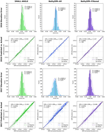 The georeferencing accuracy and precision statistics associated with each RPAS–SfM survey are presented in Table 2. An evaluation of the validation points indicated that the errors were normally distributed and not affected by any systematic distortions.