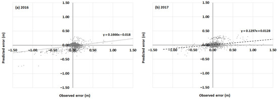 To give an indication of the impact of these limitations, we re-ran our model, this time excluding all validation points which fell within areas of dense vegetation or water surface reflections/roughness and/or on slopes of greater than or equal to 70 degrees. The output was a reduction in mean residual error of elevation error predictions from –0.04 to –0.03 m for the 2016 dataset and from –0.01 to –0.003 m for the 2017 dataset. Improved precision values were also observed: from 0.22 to 0.11 m (2016) and 0.16 to 0.09 m (2017). The slopes of the observed versus predicted elevation error relationships (Figure 7) were reduced from 0.1297 to 0.0327 (2016) and from 0.1666 to 0.0964 (2017). This suggests that, as we begin to remove the larger elevation errors from the model (resulting from dense vegetation, steep slopes (i.e., XY offsets) and reflections/roughness), we remove the systematic offsets which the model has ‘learnt’ and are left with what is likely to be random noise.