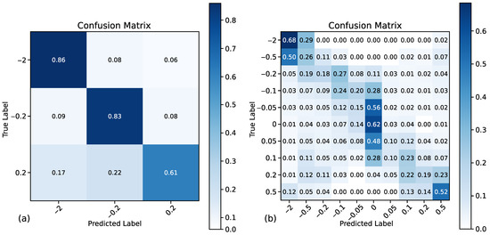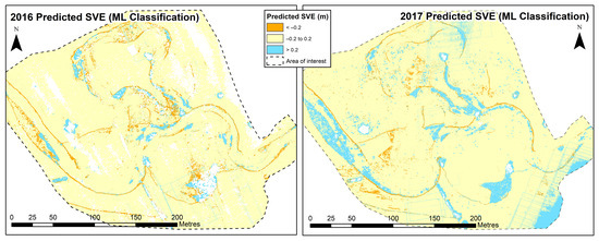 To detect geomorphic change between the two epochs of data, we subtracted the earlier refraction-corrected elevation dataset (2016) from the later one (2017) to create a DEM of difference (DoD). For both epochs, we used elevation data which had been corrected for refraction in submerged areas using the BathySfM–All method. This choice was subjective, given that complex patterns of performance which exist between the different refraction correction methods (Table 5) and another method could have been chosen instead. To isolate real geomorphic change from noise within the derived DoD, we test the implementation of our multiple regression method for predicting spatially variable error. We had initially also intended to threshold the DoDs using the outputs from our machine learning classification approach. However, as detailed in the results, these outputs were not sufficiently robust for the detailed ten-class problem to be used for error propagation purposes. Still, we provide a map of error predictions from the three-class problems for comparison purposes in Figure 9.