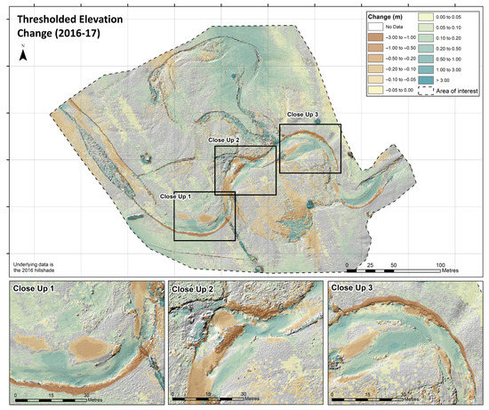 We performed this computation using the Raster Calculator tool in ArcGIS to output a new raster layer of spatially variable predicted elevation errors for every pixel within each epoch of data ( and ). We propagated these individual SVEs into the DoD using the ‘Error Propagation’ tool within the Geomorphic Change Detection v7 plugin for ArcGIS (http://gcd.riverscapes.xyz/). This is based on the approach detailed in Equation (4) [18], where is the propagated error in the DoD and and are the spatially variable elevation error predictions for each epoch respectively. Finally, we used the GCD toolbox to threshold the DoD on a cell-by-cell basis to quantify the direction and magnitude of change across the entire site.