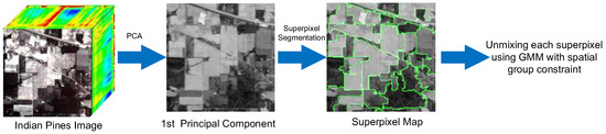 As shown in Figure 1, here, we take Principal Component Analysis (PCA) to obtain the first principle component of HSI, which is used as the base image when conducting the SS. Then, the original HSI is separated into several nonoverlapping and homogeneous regions, which are accustomed based on different spatial structures. Therefore, the pixels are highly spatially correlated. Due to the spatial dependence, each spatial group is expected to share the same endmember assignment and structure property. Furthermore, in each superpixel, only a few corresponding endmembers will participate in the process of unmixing, which means the shared structure property should be sparse. To take into account both spatial and sparse priors of the abundance, we should seek a more appropriate sparsity constraint at the level of spatial groups rather than the whole image. Recently, several mixed-norm regularizations have been proposed in machine learning, computer vision, and statistics [34,35]. One typical example is Li et al., in which a -norm regularizer is taken to exploit the group row sparsity within the abundance matrix . Similarly, Yang et al. proposed the spatial group sparse coding (SGSC) by extending the robust ability among the group training regions [36]. Here, we adopt the spatial group sparsity constraints, which is proposed in SGSNMF [31], which is generalized as