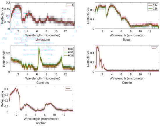 To verify the ability in estimation of both endmembers and fractional abundances, and the robustness of our algorithm under different initialization conditions, for the synthetic dataset, our algorithm is tested in the unsupervised case. To better simulate the endmember variability existing in the real hyperspectral images, the spectral of the endmember seeds are randomly selected from the ASTER spectral library [18]: limestone, basalt, concrete, conifer, and asphalt (Figure 2). The covariance of the endmember spectra are based on those endmember seeds with slight constant variations. The endmember spectra range is including three parts, which is visible and near-infrared (VNIR; 0.4 m to 1.0 m), the short-wavelength infrared (SWIR; 1.0 m to 2.4 m), and the thermal infrared (TIR; 8 m to 12 m). Their covariance matrices are constructed by , where is a unit vector controlling the major variation direction. The endmember spectral we used to generate the synthetic data are shown in Figure 3, where we can intuitively see the centers and variations of the endmember spectral signatures.