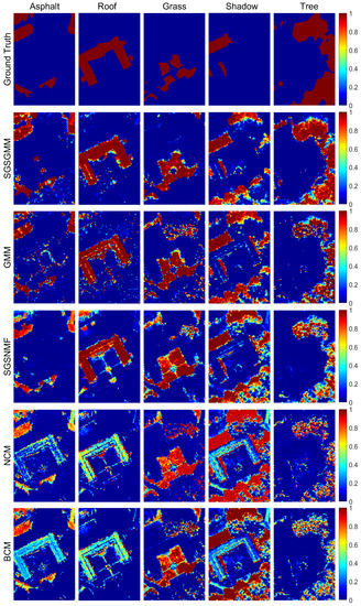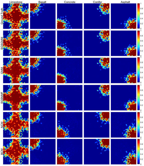 Figure 7 shows the abundance maps comparison in the Gulfport dataset. We can see that SGSGMM matches the ground truth (the first row of Figure 7) best, followed by GMM. For NCM, BCM, and SGSNMF, we do not use PCA to get the main information while using the whole bands HSI dataset as input. Nevertheless, they could not provide a more accurate estimation. For example, the first and fourth abundance maps of NCM and BCM show that the pixels of asphalt and shadow are mixed with roof, and NCM fails to estimate the abundance of the tree area. For SGSNMF, although the shape and size of its abundance maps look good in general, some pure regions are inconsistent, which also shows the insufficiency in this case. The abundance maps of SGSGMM not only show sparse areas, but also explain adjacent boundaries. More specifically, in the comparison of the fifth abundance maps, SGSGMM provides a relatively accurate estimation, whereas other algorithms perform poorly. This is because there is a large number of homogeneous regions in the fifth material, therefore sparse structures of the spatial groups can be more effectively exploited. The quantitative abundance errors of these algorithms are shown in Table 3, which also implies that SGSGMM performs best overall.