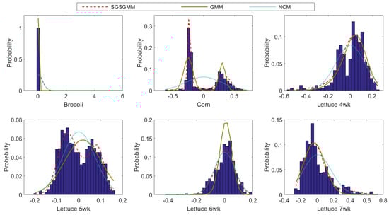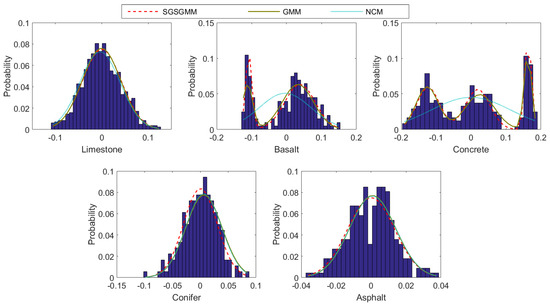 The estimated distributions and the histograms of pure materials for the SGSGMM, GMM, and NCM.
