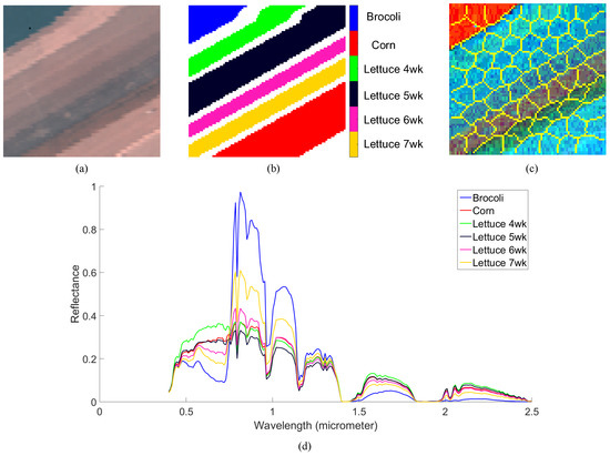 (a) The original RGB image. (b) The corresponding ground truth materials of Salinas-A dataset. (c) The superpixel map we used for the experiment. (d) The mean spectra of the 6 materials.