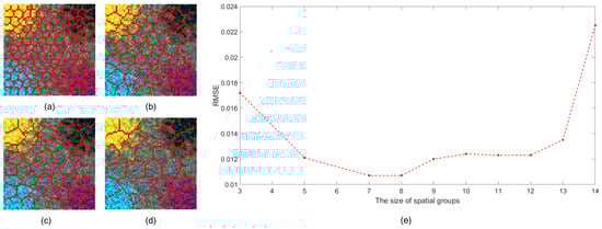 (2) Sensitivity analysis to different size superpixels: Figure 15 shows the performance of SGSGMM with different group sizes. The initialization is the default region-based VCA. From Figure 15e, we can see that when the size of superpixels is set to relatively larger, the precision of its abundance map is declining; further, comparing Table 7, we find that the precision value is gradually approaching to the GMM with the same initialization conditions. This also demonstrates that when the group size is set so large that there only exits one superpixel, the pixels within one spatial group will not be homogeneous and will no longer expect to share the same sparse property. The group sparsity priors will have similar sparsity constraints to the GMM model. When the size of superpixels is set to , the performance of the unmixing becomes the best. However, when the group sizes is setting smaller, the accuracy of the unmixing will decrease. This is because when the superpixel is too small, there is not enough data for training, and those superpixels will have no statistical significance.