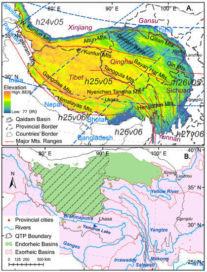 Study Area of Qinghai-Tibetan Plateau (QTP): (A) elevation, major Mts. (i.e., mountains) ranges, and provincial and country borders; (B) provincial cities, rivers, and the endorheic and exorheic basins. The grids, in dark blue dashed lines, overlaid are the corresponding MODIS tiles (e.g., h25v06). Boundaries of Changtang Plateau (shadowed with the dashed lines in (B) and the endorheic, and exorheic basins were determined from the 15-s HydroSHEDS (Hydrological data and maps based on SHuttle Elevation Derivatives at multiple Scales) drainage basin dataset []. Map created using ArcGIS 10.6 (ESRI, CA, www.esri.com).