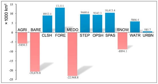 Land cover net gain and net loss in the Qinghai-Tibetan Plateau. FORE stands for all forest types; AGRI, agricultural land; BARE, bare ground; CLSH, closed shrubland; MEDO, meadow; OPSH, open shrubland; SNOW, permanent snow cover; STEP, steppe; SPAS, sparse vegetation; URBN, urban area; and WATR, water.