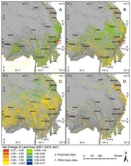Net changes of (A) forest, (B) closed shrubland, (C) meadow, and (D) agriculture from 2001–2015. The red box in (A,B) indicates the forest habitats destroyed by the earthquake in 2008. Land changes are significant with a p-value < 0.1.