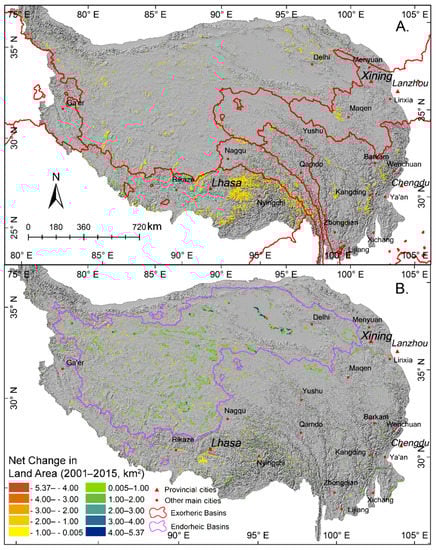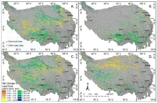 The special natural settings of QTP and recent rapid growth of the transportation infrastructure have promoted the booming of tourism (e.g., 29.9% of Tibet’s GDP in 2016) [,,]. As a result, economic development has absorbed more and more agricultural laborers into urban areas []. This is reflected in the population change (Figure A3A): during 2000–2015, the urban population growth rate, with an average of more than 15 persons/km2, was much higher than the rural population growth of 0–3 persons/km2. Similar to many other regions in China, rural-urban migration has driven the development of urbanization in QTP, and urban expansion is mostly converted from farmland near the major cities [].