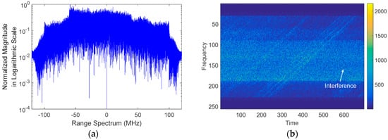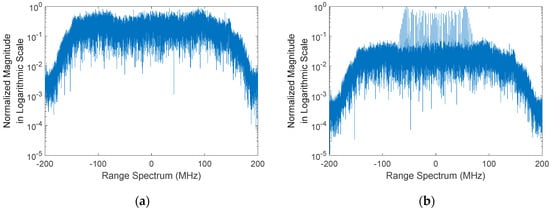 In SAR raw echoes, the presence of RFI will reduce the signal to interference noise ratio (SINR), bury the scattering response of weak target, and distort the dynamic range of the raw echoes. Besides, the receiver is sensitive to saturation by high-power in-band emissions, especially when aimed towards the interfering sources in the main-lobe []. Figure 2 compares particular range spectrums of the real measured SAR echoes with and without RFI. The data is recorded by a Chinese L-band airborne SAR system with the bandwidth of 300 MHz. The echoes are linear frequency modulated, as shown in Figure 2a. Compared with Figure 2b, many RFI spikes existed and the power is dynamically varied, which significantly reduce the SINR and altering the spectrum shape.