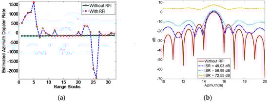 An important feature of SAR is the capability to generate high resolution images. Airborne SAR platforms would introduce significant trajectory deviation and motion errors due to air turbulence. With the absence of enough precise inertial navigation system data, it is required to estimate several critical matched filter parameters directly from the raw data, such as the Doppler centroid and the Doppler modulation rate []. The presence of RFI would lead to biased estimates of these parameters. Figure 3a shows an example of estimated azimuth Doppler rate under the cases with and without RFI. In this case, the resulting image will defocus and the quality is severely degraded. Figure 3b illustrates the point target response after matched filtering using biased parameters under different interference to signal ratio (ISR). With the increase of ISR, the side lobe level is raised and the target response is significantly distorted.