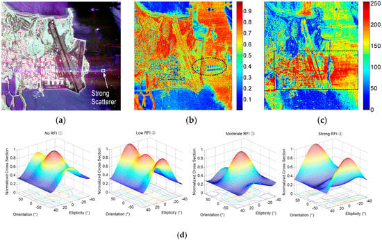 Take a further insight, four areas inside the airport runway corresponding to various RFI conditions are selected for illustration, as marked in Figure 4a. They are referred to as No RFI Area ①, Low RFI Area ②, Moderate RFI Area ③, and Strong RFI Area ④, respectively. These areas possess the same scattering mechanisms and should have similar reflectivity. The co-polarized signatures are computed as shown in Figure 4d. These four distributed areas should have the same scattering mechanism with the one under ideal occasion, i.e., low ISR condition. However, with the raise of RFI energy level, the distortion to the shape and intensity of the co-polarized signatures become more severe. Therefore, the distortion of the image amplitude and phase caused by RFI would lead to erroneous polarization signatures. The erroneous polarization signatures would further bias the interpretation of scattering mechanisms.