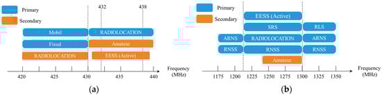 Illustration of allocated radio services in the vicinity of (a) P-band: 432–438 MHz and (b) L-band: 1215–1300 MHz.
