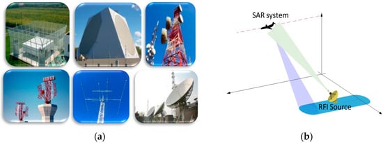 Most of the RFI sources are associated with human activity over land. Terrestrial commercial or industrial radio devices are considered as major RFI sources for SAR, including but not limited to radiolocation radars, wind profiler, telecommunication devices, television networks, amateur radios, etc. Figure 6a illustrates possible terrestrial radio emitters. In recent years, many terrestrial RFI cases have been observed in airborne SAR systems such as AIRSAR [,], E-SAR [], UAVSAR [], and space-borne SAR systems like PALSAR [,] and Sentinel-1 [,,].