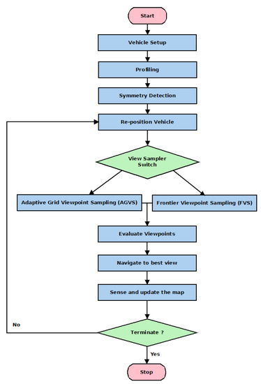 - Shade, R.; Newman, P. Choosing where to go: Complete 3D exploration with stereo. In Proceedings of the 2011 IEEE International Conference on Robotics and Automation (ICRA), Shanghai, China, 9–13 May 2011; pp. 2806–2811. [Google Scholar]