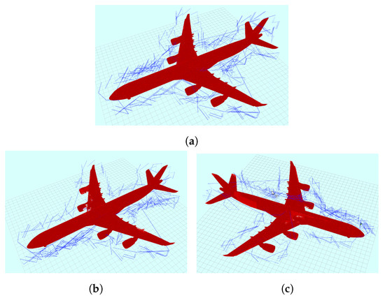 - Aircraft ModelA 3D reconstructed model of an aircraft was generated in this experiment by exploring the bounded box of the structure. A dense point cloud map was generated using the data collected at the selected viewpoints along the generated exploration path in simulation.Figure 8 presents the achieved coverage and the path generated to cover the aircraft model. Table 2 illustrates the results obtained by our proposed method when compared to other two approaches in terms of coverage, distance, and entropy reduction. As shown in the table, the density and resolution of the reconstructed model is low () since the profiling was performed at the edges of the bounded workspace from a long distance. The overall achieved coverage approaches high percentages () and improves the model density when our proposed Guided NBV method was used. Since the aircraft model is symmetric, the utility function weights were selected to achieve high density and utilize the existing prediction measures. Using the proposed utility function with the selected weights, as shown in Table 1, facilitated the capturing of more data by allowing the UAV to travel around the structure more efficiently. The plot shown in Figure 9 illustrates the average density attribute along the iterations for each of the used utility functions. As shown in the plot, the proposed utility function achieves higher density values per voxel in each iteration than the other two approaches. The plot is non-monotonic since the average density was computed based on the size of point cloud and the number of occupied voxels in the octree. At complex curved areas, some voxels hold few points compared to other voxels, which creates the difference in the average density. The details of the structure were captured with high coverage density when evaluated with voxels of resolution 0.05 m. However, this achieved improvement in coverage comes at a cost which is an increase in the traveled distance.