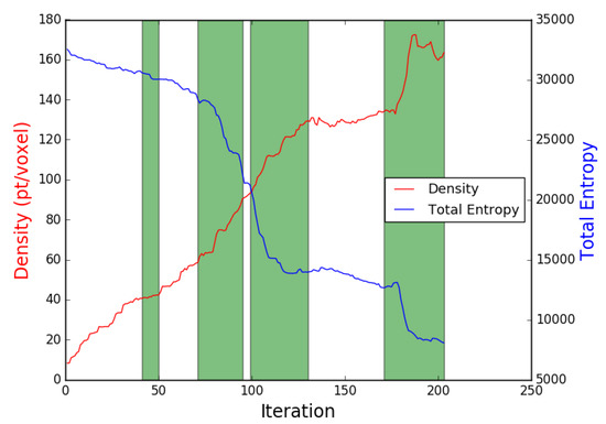 - Power Plant ModelSimilarly, the power plant structure was 3D reconstructed by exploring the bounded box of the model workspace. The collected data at each viewpoint in simulation were used to generate a dense point cloud map. The generated paths and achieved coverage are shown in Figure 10, and the results compared with two other approaches are illustrated in Table 3. As shown in the table, the resolution and density of the reconstructed structure is low ().The Guided NBV achievesd high coverage percentages compared to the two other illustrated approaches. The longer path distance is compensated by a better coverage percentage and average density (proposed density = 177 pt/voxel, Bircher et al. [17] = 140 pt/voxel, Isler et al. [29] = 152 pt/voxel). Moreover, the Guided NBV achieves high coverage () for the power plant structure compared to Song and Jo [21] () and Song and Jo [21] () using similar setup and structure model.The power plant model is not symmetric, thus the utility function weights were selected to achieve high density, as shown in Table 1. The plot shown in Figure 11 illustrates the average density and entropy attributes along the iterations showing the FVS effect on the reduction of the entropy and the increase of the density at some areas. Using the AGVS sampling method with FVS facilitated dense coverage, exceeding . This is mainly due to the ability to take larger steps to escape local minima.