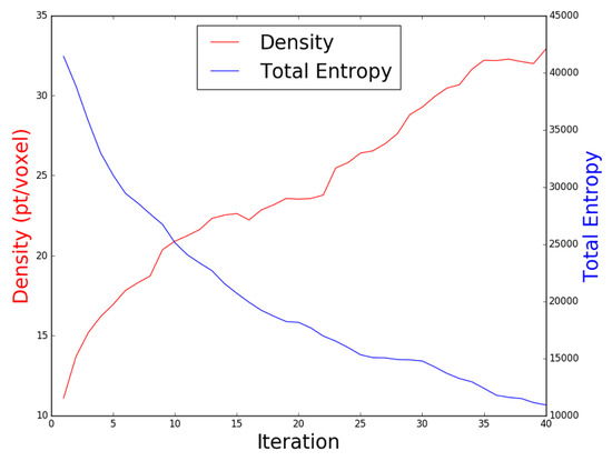 - Representative ModelA representative model in an indoor lab environment was used in this experiment. The proposed Guided NBV was performed starting with a profiling stage, and then executing the NBV iterative process using quadrotor platform, as described previously. The generated exploration path is shown in Figure 13, which consists of 40 viewpoints, with a path length of 32 m, generated in min. The obtained average density is 33 points/voxel and the entropy reduction value is . The plot shown in Figure 14 shows the decreasing entropy and increasing density behaviors across the iterations.A feasible exploration path was generated by our proposed Guided NBV approach for the indoor structure. This is demonstrated in the 3D OctoMap (resolution of m) of the structure, which was generated while exploring the environment using the real quadrotor UAV platform and collecting data along the path. The final textured 3D reconstructed model is shown in Figure 15. Trajectory planning could be performed to connect the waypoints optimizing the path for the UAV acceleration or velocity as a further enhancement. The illustration of the indoor lab experiment of Scenario 3 is shown in a video at [37].