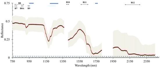 Near-infrared short-wave infrared (NIR-SWIR) reflectance spectrum (%), plastic absorption feature locations and satellite detection windows. Thick solid red line is median reflectance spectrum and shadowed area is the standard deviation of all plastics measured (data adapted from [53]). Thick horizontal bars highlight the regions of the spectrum with major absorption features (data adapted from [50]). Double arrow end lines show the maximum width of the spectral response function and the band names of the Sentinel 2B Multi Spectral Imager (MSI). Dashed line is typical oceanic seawater reflectance shown for comparison (data corresponding to OPENOCEAN-SW2 spectra adapted from [54]).