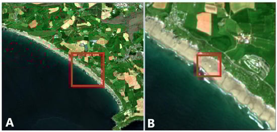 Example of plastic debris detection experiment during a Sentinel-2B overpass on 15 May 2018 over Whitsand Bay (United Kingdom). (A) Overview of the bay area with the study area indicated by a red square, shown in detail in (B) with the positions of the plastic targets (10 × 10 m) visible within the red square.