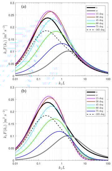 We observe that for some relatively low tilt angles, the radial velocity spectrum contains more energy than the u-velocity spectrum. Following Equation (4), we notice that has contributions (also sometimes referred to as contamination) from , , , , , , i.e., of the u-, v- and w-velocity spectra and -, -, and - cospectra. The Mann model (uniform shear version) assumes , so the spectra of the radial velocity of a tilted lidar beam aligned with the wind is at least, in the light of the Mann model, a mix of u-, and w-spectra and -cospectra. Note that at 15 tilt, ‘positively’ contributes to and the opposite behavior occurs at 165.