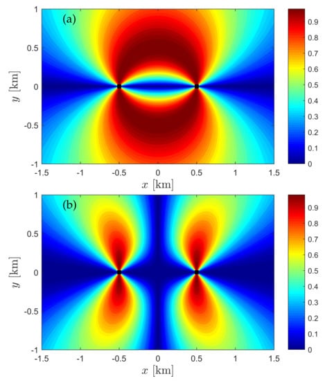 The systems in Equations (7) and (8) show that the estimations of and depend on how invertible the geometrical matrices and are. For the simple case where , one can notice that is highest at and that is singular for small or equal azimuths with respect to the axis between both lidars, e.g., and . For results are similar except that the matrix also becomes singular for supplementary angles. This is because of the cosine and sine of the azimuths are squared, so the system cannot distinguish the contributions of the u- and v-components. Figure 3 shows within a spatial horizontal domain both and for a dual-Doppler scanning system. The direct methods for estimating velocity variances will thus show high random errors in the areas where we can estimate the velocity components with low random errors.