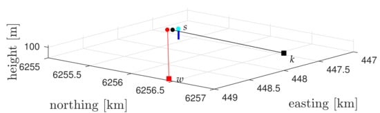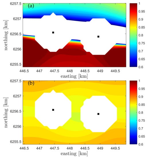 Figure 12 and Figure 13 illustrate examples for two wind directions of the variation of the velocity-variance biases within a horizontal domain using the locations of the lidars of the experimental campaign at Høvsøre. We assume that all points in the domain are measured at a height of 100 m and . We also constrain the analysis to all points within a rectangular domain where both lidars scan with elevation angles lower than 10.