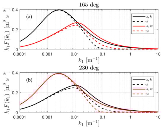 Radial velocity spectra of the k and w WindScanners and those of an ideal sonic anemometer aligned with either WindScanner (s, w or s, k) for two wind directions: 165 (a) and 230 (b).