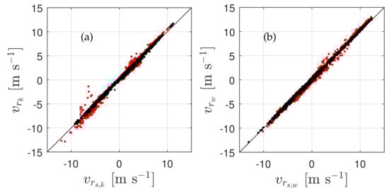 Scatter plot of the radial velocities of the WindScanners and the sonic anemometer in the beam direction of the k lidar (a) and w lidar (b). The red markers correspond to all data and the black markers to selected data (see text for details)