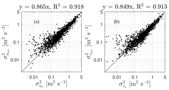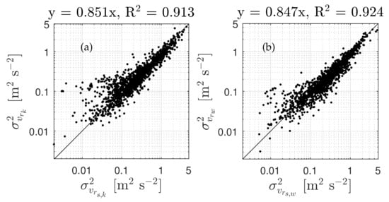 Scatter plot of the horizontal velocity-component variances of the WindScanners and the sonic anemometer. The results for the u- and v-velocity components are shown in frames (a) and (b), respectively. The results of a linear regression through the origin are also shown together with the coefficient of determination R.