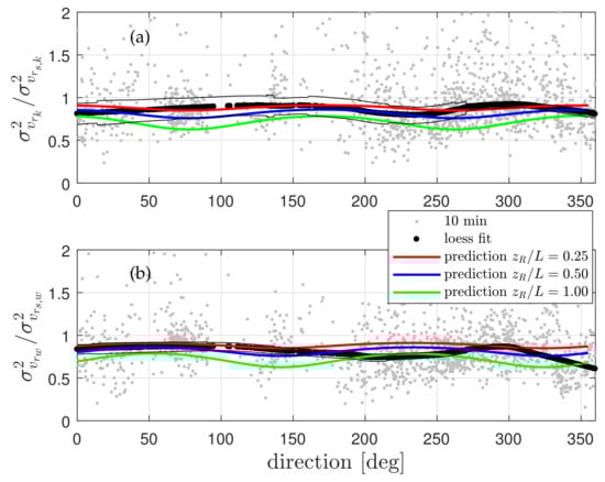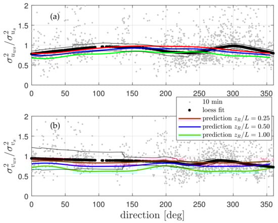 Since we know that these ratios of the velocity-component variances are also wind direction and turbulence dependent, we can also show their behavior with the measured direction (see Figure 10). The figure illustrates that these ratios are below and very close to one. The predictions for and match the measured average bias within some direction ranges closely well but, as with the radial velocity variance ratios, each 10-min period is characterized by different turbulence characteristics, and so we should not expect a perfect match for all measurements.