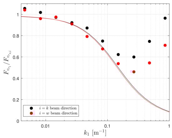 where characterizes the length of the probe volume. This is a weighting function typical of pulsed lidars (see e.g., [28]), where is half the length of a rectangular pulse. It is clearly shown the effect of filtering, particularly for the high wave numbers.