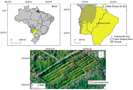 The experiment was conducted in the forage section (Figure 1) at Fazenda Escola, in the municipality of Terenos—Mato Grosso do Sul (MS), Brazil (latitude 20°26′34.31″S, longitude 54°50′27.86″W, altitude 530.7 m) (Figure 1). Before the implementation of the experiment, the samples of soil were collected from the 0–20 cm layer to determine fertility (Table 1). Dolomitic limestone was applied at the rate of 1.2 t ha−1 (total relative neutralizing power (TRNP) = 80%). Before planting, the area was fertilized with 100 kg ha−1 of P2O5, 100 kg ha−1 of N (in the form of urea), and 60 kg ha−1 of K2O. The Panicum maximum cv. BRS Tamani grass was planted in November 2015.