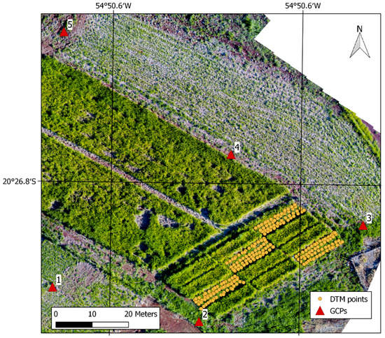 Distribution of digital terrain model (DTM) points and ground control points (GCPs), both collected with real-time kinematics (RTK).