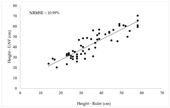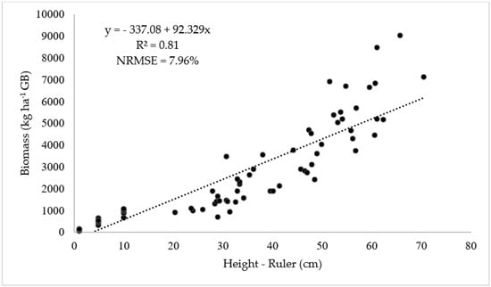 The CC between the height measured with the ruler and the biomass (Figure 5) was 0.90, indicating that these measurements were correlated. The NRMSE, when considering the height measured with the ruler and the biomass, was around 7.96%.