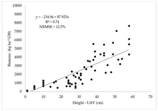 The NRMSE was around 12.5% when considering the height measured by the UAV and herbage mass. There was a correlation between the height measured by the UAV and herbage mass (CC = 0.86) (Figure 6). Each additional centimeter in the height measured by the UAV represented an increase of approximately 88 kg ha−1 in green biomass for each experimental plot, i.e., herbage mass increased proportionally to the canopy height when measured by the UAV. This observation corroborates the reports of Terra Lopes [33] and Casagrande [34], who observed higher herbage allowances at greater heights.