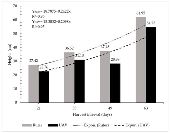 Each regrowth day corresponded to a 0.2422 m increase in height when measured by the ruler and 0.2098 m when calculated by the UAV (Figure 7). A similar regrowth trend was observed by Maranhão [37] and Ansah [38] that assessed the productive and structural characteristics of different cultivars submitted to different cutting intervals.