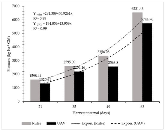 Biomass estimated by the ruler and by the UAV at different harvest intervals.