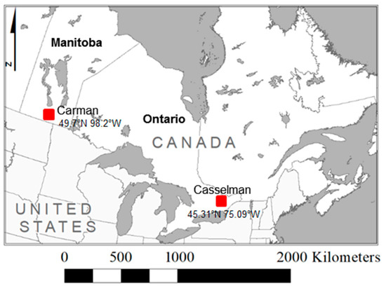 The in situ SMC measurements considered in this study were recorded by seven RISMA stations in the Carman area in 2015. These stations collect SMC data every 15 minutes [33]. Three sets of hydra probe sensors [34] are installed at each station to measure real dielectric permittivity, soil moisture, and soil temperature at 0–5 cm (vertical), 5 cm (horizontal), 20 cm (horizontal), 50 cm (horizontal), and 100 cm (horizontal). In our study, we considered the integrated SMC measured vertically from 0–5 cm. The RISMA data are collected by the Government of Canada through Agriculture and Agri-Food Canada and are available online [35]. A second intensive agriculture area was considered for assessing the proposed method on an independent dataset. This second area is located within the South Nation River watershed, close to the town of Casselman (45.31°N, 75.09°W), in eastern Ontario. The site is predominantly flat, except for a few elevation changes. A variety of soil types are present, including silty loam, sandy, and clay soils. This area is also equipped by another RISMA network of stations, providing the in situ SMC data to be used as reference. The location of the two test areas is shown in Figure 1.