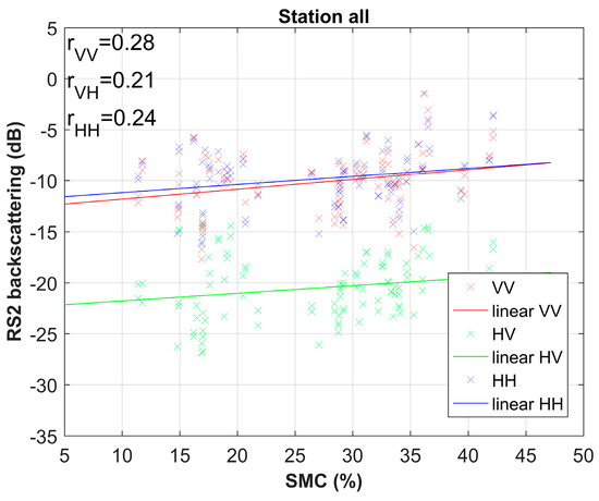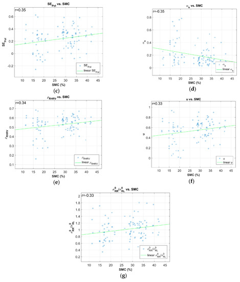 It should be also mentioned that the surface scattering mechanism from the m-delta or m-chi decomposition reported r values were similar to σ°. Conversely, the degree of polarization (m), which was indicated as a good descriptor of vegetation biomass in previous studies [47], did not show any significant correlation to SMC, since the increasing depolarization produced by the increasing biomass could not be observed on the scarcely vegetated surfaces of this study.