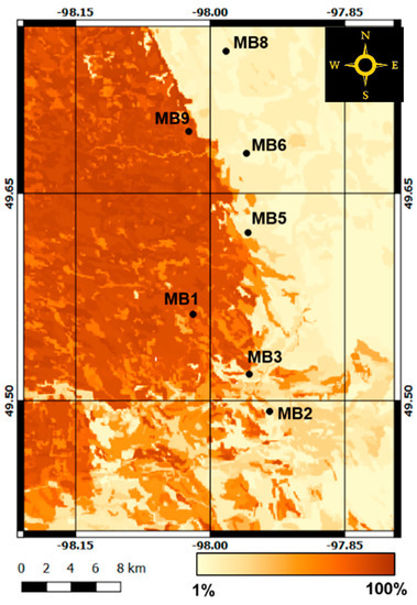 Since the experimental site is topographically flat and soils were bare or scarcely vegetated during the investigated time period, the effect of both local surface slopes and vegetation on the relationship between σ° and SMC was negligible. The data dispersion and the differences between stations could be therefore attributed to differences in soil texture, surface roughness, and observation geometry. Figure 4 shows the soil texture of the study area, expressed in sand percentage, with the location of the RISMA stations: darker shades indicate more sandy soil texture. In this respect, MB1 and MB9 were characterized by almost sandy soils, MB5, MB6, and MB8 had over 50% of clay, and MB2 and MB3 had a mixed type of sandy clay loam. The differences in soil texture affected the relationship between soil permittivity and SMC and therefore the one between σ° and SMC.