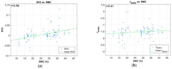 The highest correlation obtained by the SV3 parameter could be explained considering that the SV3 parameter was associated with the average power received in circular polarization and the polarized portion of the backscattered signal was dependent on SMC. The depolarized portion of the backscattered signal was instead triggered by other surface parameters, such as soil roughness or vegetation canopy. The other SV components reported r values similar to those obtained by σ°, and their worst performances could be simply attributed to the small dataset available. The correlation to SMC of parameter could be explained considering that contains information about the dielectric properties of the surface [46].