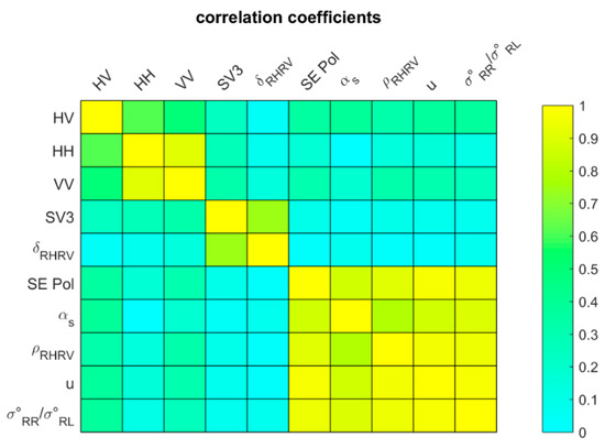 The sensitivity analysis was repeated for the CP parameters. Among the parameters generated by the simulator, the most correlated to SMC were the fourth component of Stokes vector (SV3), the RH–RV phase difference (), the Shannon entropy polarimetric component (SEPol), the alpha angle related to the ellipticity of the scattered wave (), the RH–RV correlation coefficient (), the conformity coefficient (u), and the circular polarization ratio . These seven parameters showed better correlation to SMC than σ°, as pointed out by the r values listed in Table 1. As shown in Table 3, in which the parameters better correlated to SMC than σ° are listed, all the CP parameters revealed positive correlation with the SMC, except for and which showed inverse relationships to SMC.