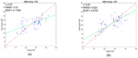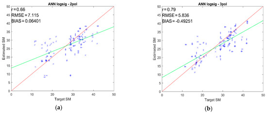 ANN estimated vs. in situ SMC for the two different combinations of input σ°: (a) 2pol and (b) 3pol.